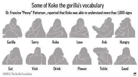 Koko was taught sign language from an early age as a scientific test subject and eventually learned more than 1,000 words, a vocabulary similar to that of a human toddler.