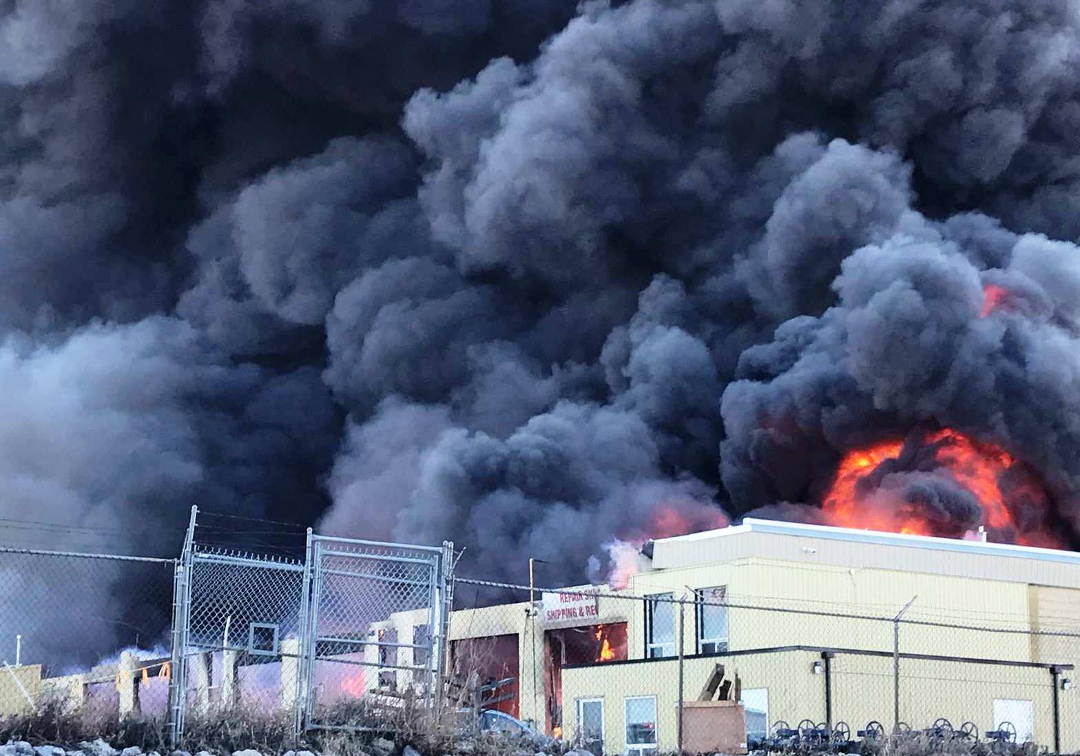 Firefighters battle an Apr. 17 blaze at Red Deer Ironworks that destroyed an outbuilding, causing roughly $9 million in damage.