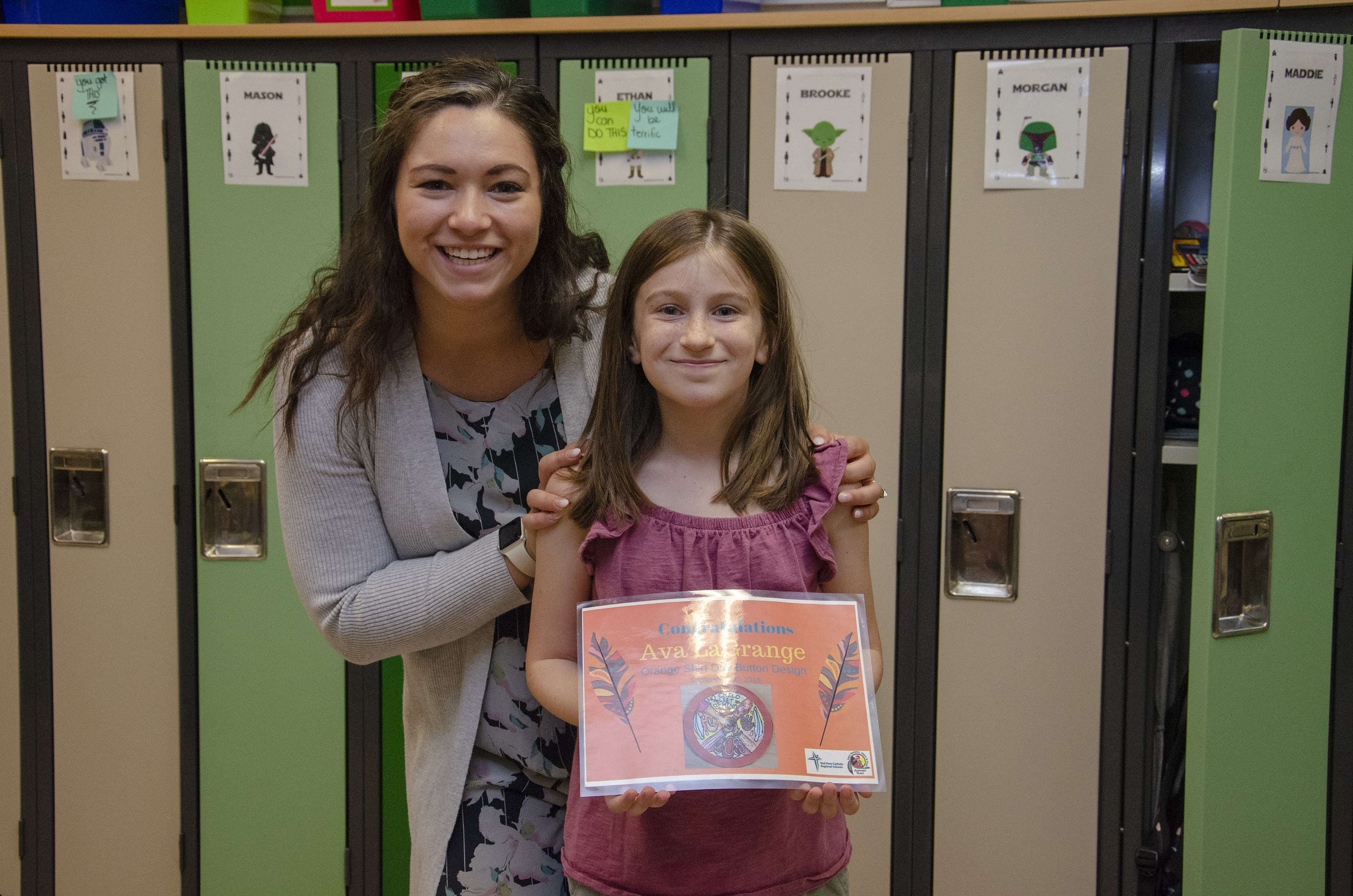 Ava LaGrange, a Grade 5 student from St. Elizabeth Seton School artwork is the winning button. On Orange Shirt Day, her artwork will be distributed to her school in the form of buttons. In addition, St. Francis of Assisi Middle School students and staff created the buttons.