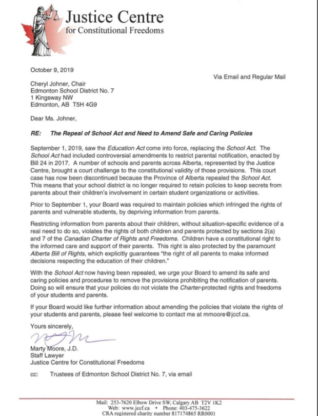 The letter goes on to suggest that because the United Conservatives have implemented the Education Act, school boards should do away with previous policy which restricted such information from parents. It reiterates that should school boards maintain those policies, they will be violating the Charter-protected rights and freedoms of students and parents.