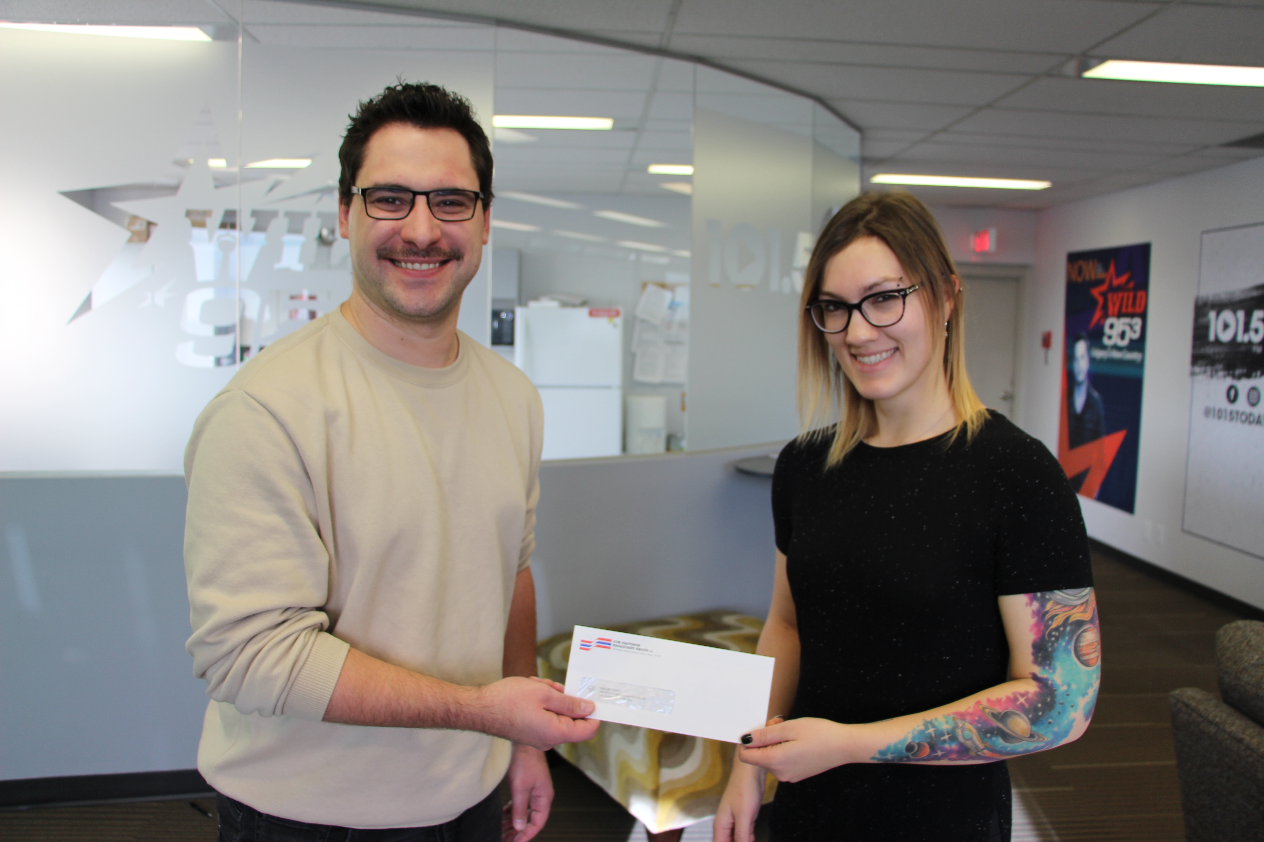 Jonathan Best from JPBG Calgary presents Shelby Emro with her scholarship cheque.