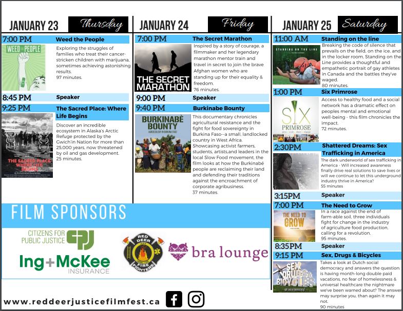 The Secret Marathon’s message of equality is in good company among the other eight films and their prevalent social subjects. From Weed the People’s examination of marijuana’s impact on ill children to Shattered Dreams’ look into the dark world of sex-trafficking in America, the Red Deer Justice Film Festival continues to promote education and international connection in the face of some challenging realities.