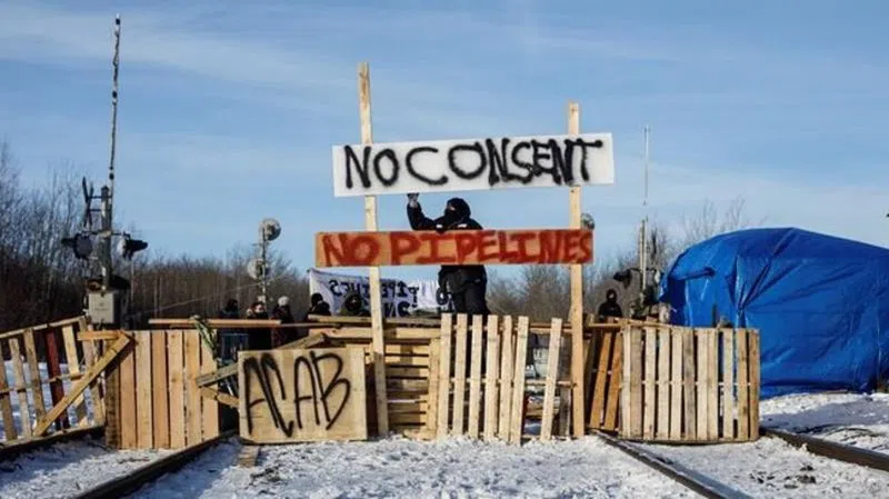 The blockade consisted of wooden pallets on the tracks and signs that say “No Consent” and “No Pipelines on Stolen Land.”