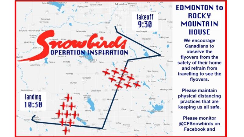 The Snowbirds will be departing Edmonton at approx. 9:30 a.m. Saturday and will fly over Red Deer before heading to Rocky Mountain House, where they expect to touch down at around 10:30 a.m.