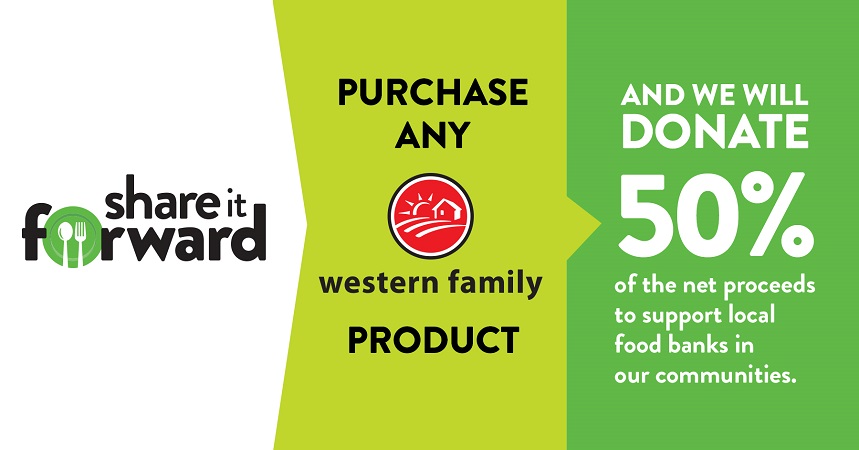The Share it Forward campaign runs June 11-17, and will see 50 per cent of net proceeds from the purchase of Western Family products, donated to local food banks – up to a maximum of $300,000.
