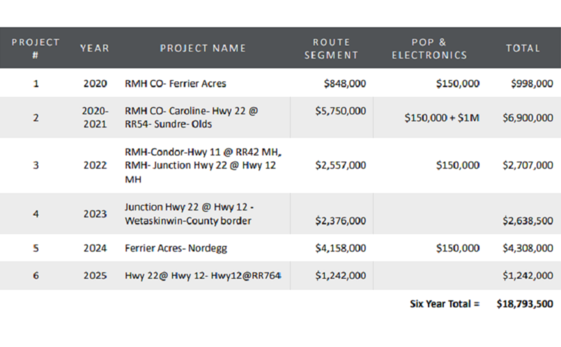 Estimated build costs for the Broadband project. (Photo from Clearwater County Broadband Backbone Plan 2020-2025)The proposed project indicates possible connections through adjacent municipalities and alternate routes to Calgary and/or Edmonton.