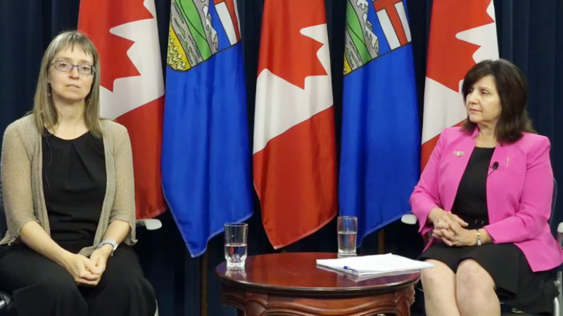 Chief Medical Officer of Health Dr. Deena Hinshaw (left) and Education Minister Adriana LaGrange are shown during a Q & A session on July 28. On Tuesday they will provide an update on Alberta's return to school plan.