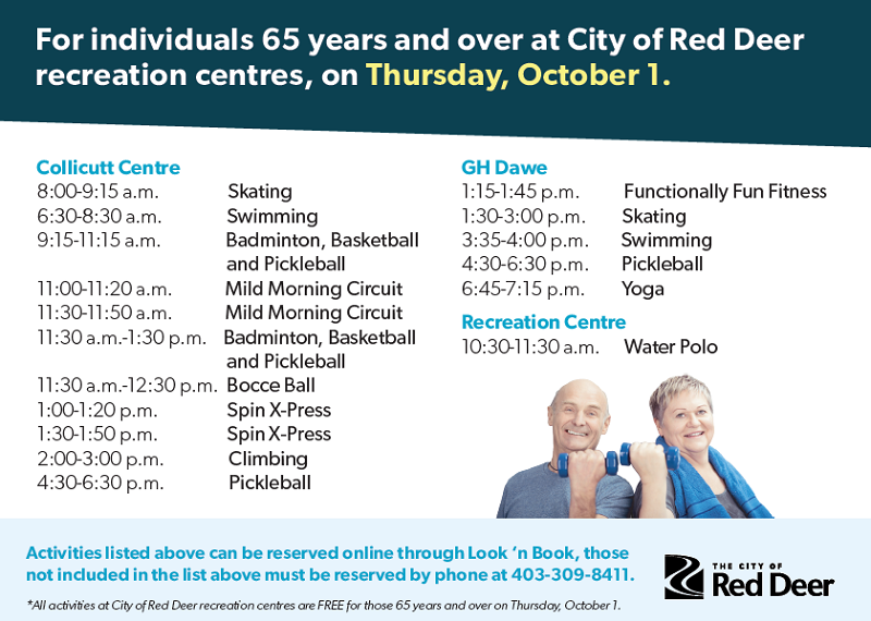 The United Nations International Day of Older Persons is coming up on October 1 with free activities happening at Red Deer’s recreation facilities.