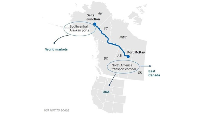 The 2570-kilometre rail line will run from Fort McMurray through the Northwest Territories and Yukon to the Delta Junction in Alaska, where it will connect with existing rail and continue on to ports near Anchorage.