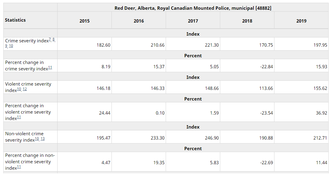 The numbers released Oct. 29 by Statistics Canada show Red Deer’s Crime Severity Index (CSI) for last year was nearly 16 per cent higher than 2018, while the CSI for violent crimes surged by over 36 per cent.