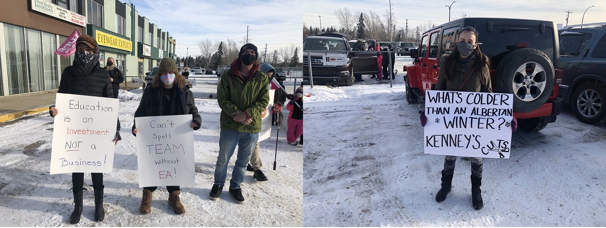 Over 80 union protesters gathered outside education minister Adriana LaGrange's Red Deer constituency office on Thursday, calling for increased education funding to help address growing safety concerns in schools during the COVID-19 pandemic. (rdnewsNOW/Sheldon Spackman)