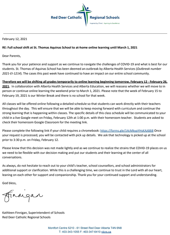 “The cases this past week have continued to have an impact on our entire school community,” Kathleen Finnigan, Superintendent for Red Deer Catholic Regional Schools said in a letter to parents.