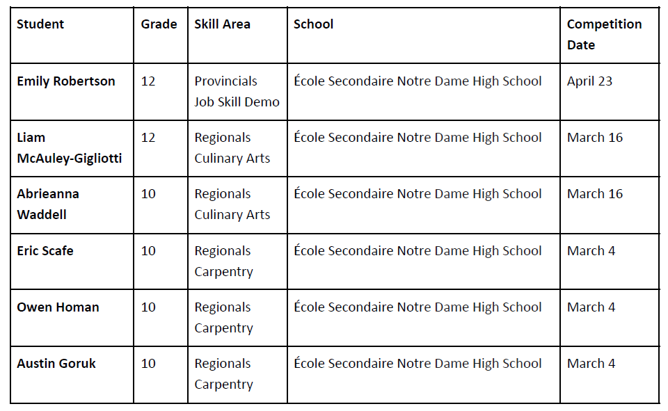 “Skills competitions are an excellent way for students to share their gifts, support their future goals and showcase the many hours of work students have dedicated to their craft. Thank you to Skills Canada for their ongoing support of careers and trades,” said Principal Graeme Daniel at St. Joseph High School
