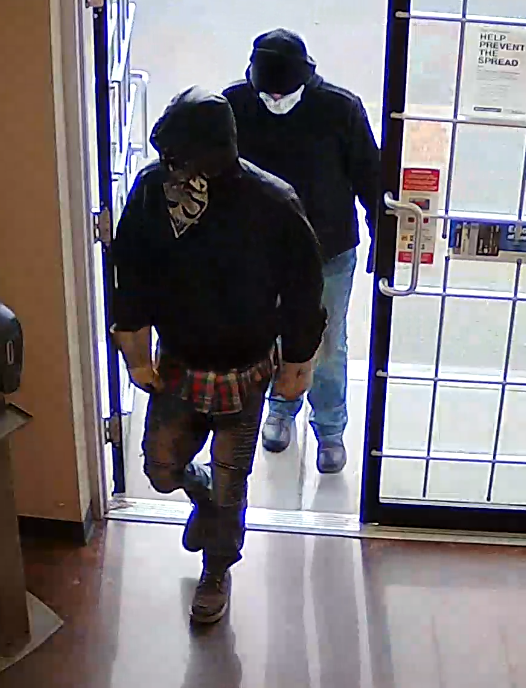 Police say two men wearing face coverings entered the store with what is believed to be a firearm and demanded cash and other goods. A quantity of cash and goods were obtained before the suspects fled from the store in what is believed to be a 2009-2010 black or dark blue Dodge Ram 1500 Crew Cab pick-up truck.