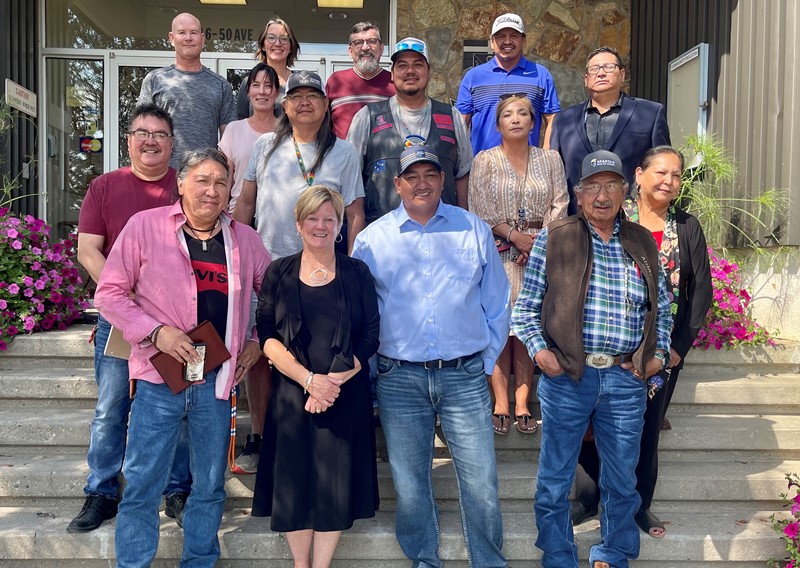 O’Chiese First Nation Chief Douglas Beaverbones, Rocky Mountain House Mayor Tammy Burke and Sunchild Frist Nation Chief Jonathan Frencheater and councillors outside the Rocky Mountain House Town Office on July 7, 2021. (Photo by Marina Kulich | Town of Rocky Mountain House)