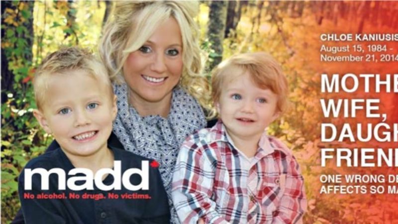 It is in honor of Chloe Kaniusis, a 30-year-old mother of two young boys, who was killed in a car crash by a drunk driver on her way home from Christmas shopping near Eckville in November 2014.