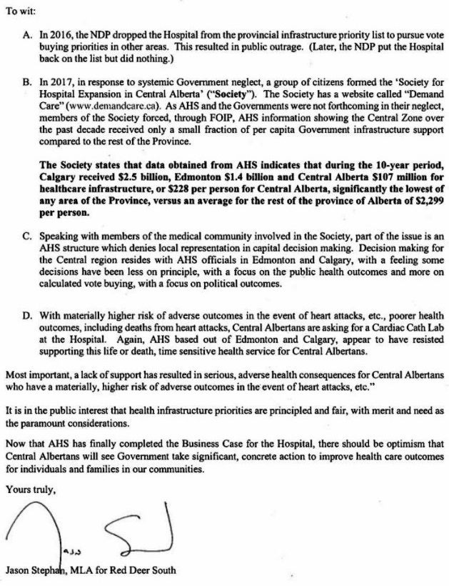 Stephan says the letter below provided to local media contains excerpts from a letter signed by Central Alberta MLAs on behalf of area constituents throughout the region who rely on the hospital in Red Deer.