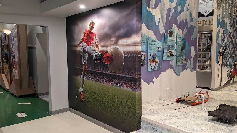 To house this new system, the Hall has three large touchscreen kiosks in their newly wrapped Hall of Fame Virtual locker Room. This mural pays homage to some of the sports featured by our Honoured Members.