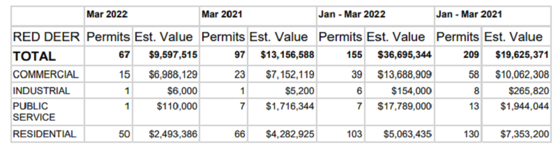 Building permit values in Red Deer were down in March 2022, compared to a year earlier.