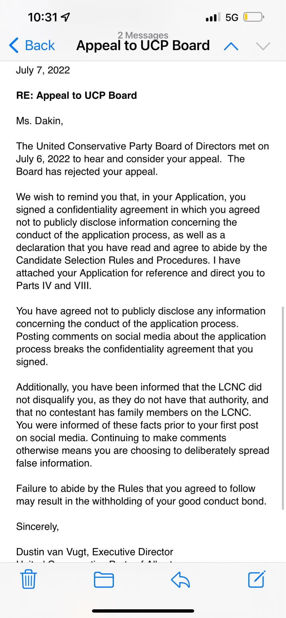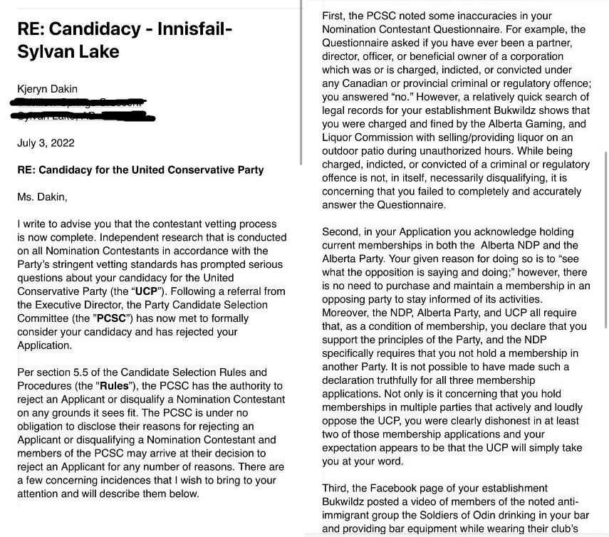 Dakin has been disqualified from running as a candidate for the UCP nomination in Innisfail-Sylvan Lake — currently held by Devin Dreeshen.