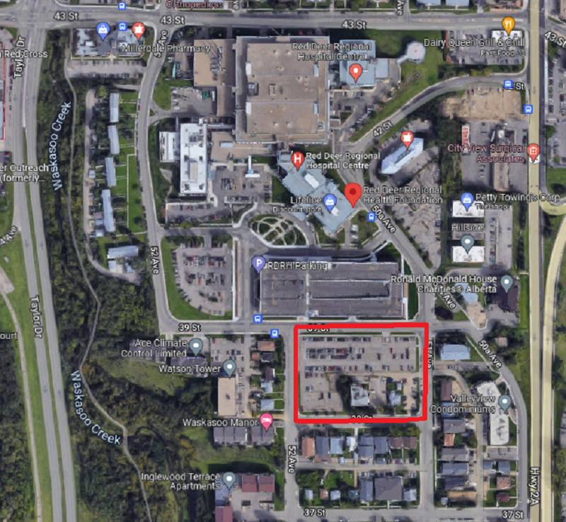 A red box shows the area where one part of expansion will occur, just south of the current Red Deer Regional Hospital Centre. The entire area within the red box may not be subject to expansion, but is the area being referenced by Alberta Infrastructure. (Google Maps)