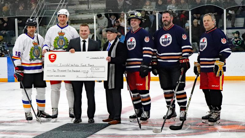 The Innisfail RCMP and Fire Department have announced that their first annual “Battle of the Badges” charity hockey game has raised 1, 487 pounds of food and $6,038 in cash for the Innisfail Food Bank.