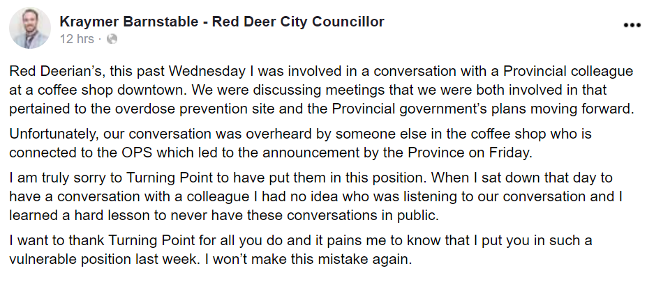 A Red Deer city councillor has apologized following an unfortunate situation linked to an announcement this past week about Red Deer’s overdose prevention site.