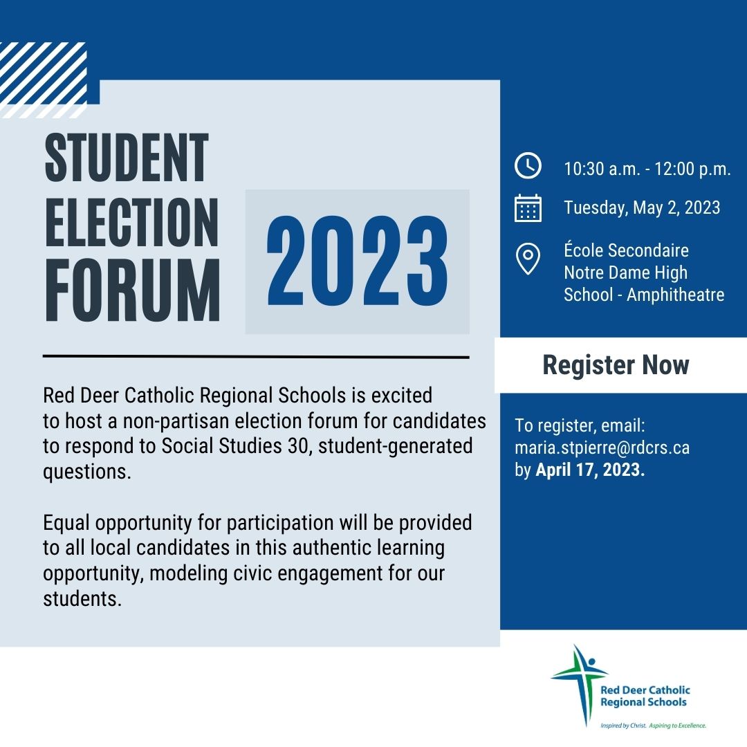 The District will be hosting a Student Election Forum on Tuesday, May 2 at École Secondaire Notre Dame High School (50 Lees St) from 10:30 a.m. – 12 p.m. The non-partisan election forum will give candidates the opportunity to respond to questions generated by high school students from the Social Studies 30 program.