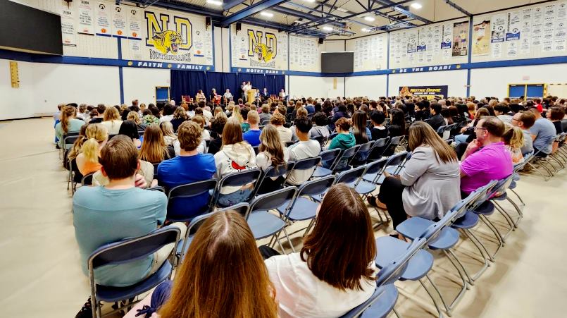 Students listen as candidates answer questions about economic growth and post-secondary tuition during an election forum at Notre Dame High School on May 2, 2023. (rdnewsNOW/Josh Hall)