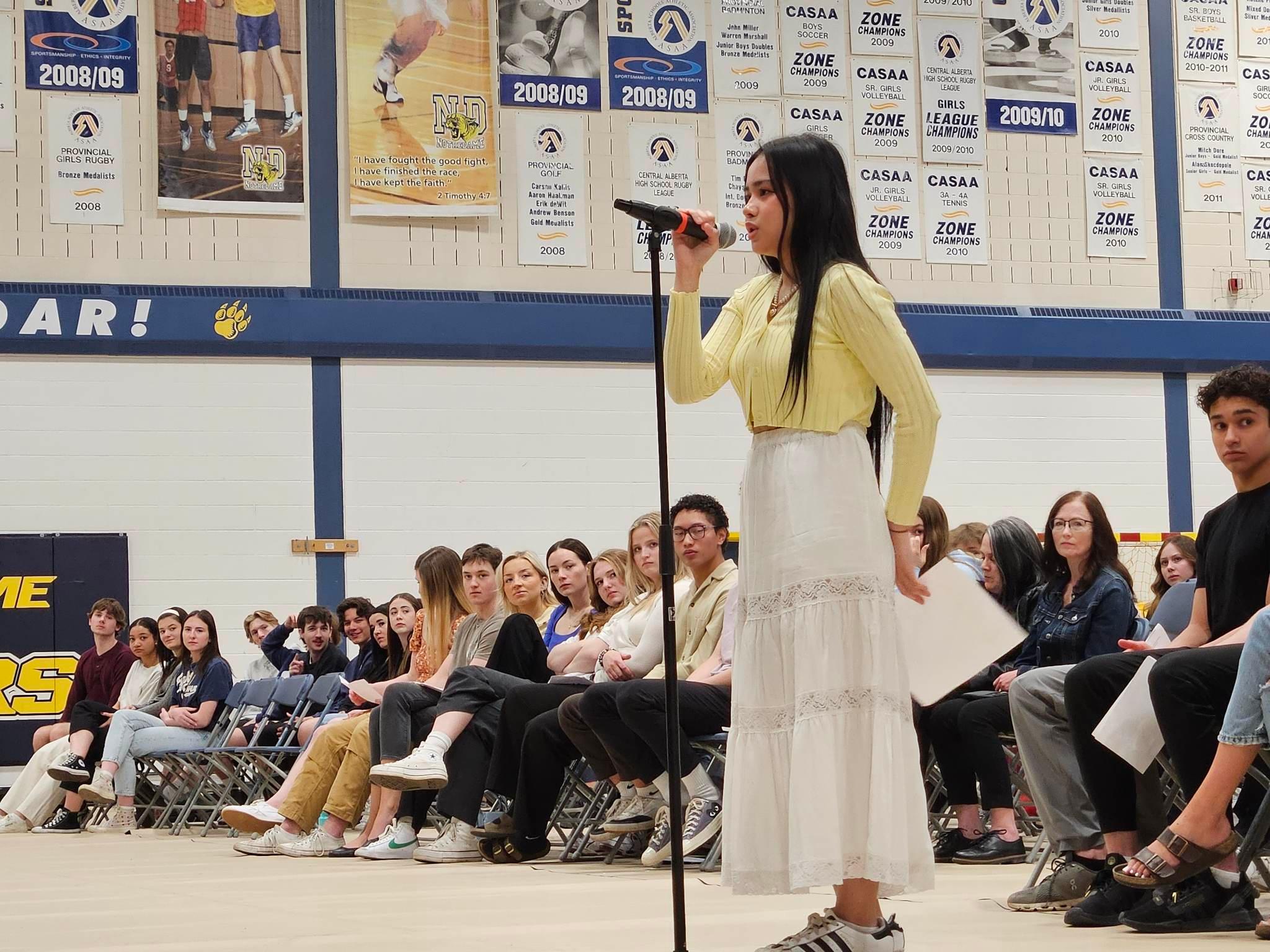 Marina Brese, a Grade 12 student at Notre Dame High School in Red Deer, introduces a candidate during a schools-only election forum on Tuesday. (rdnewsNOW/Josh Hall)