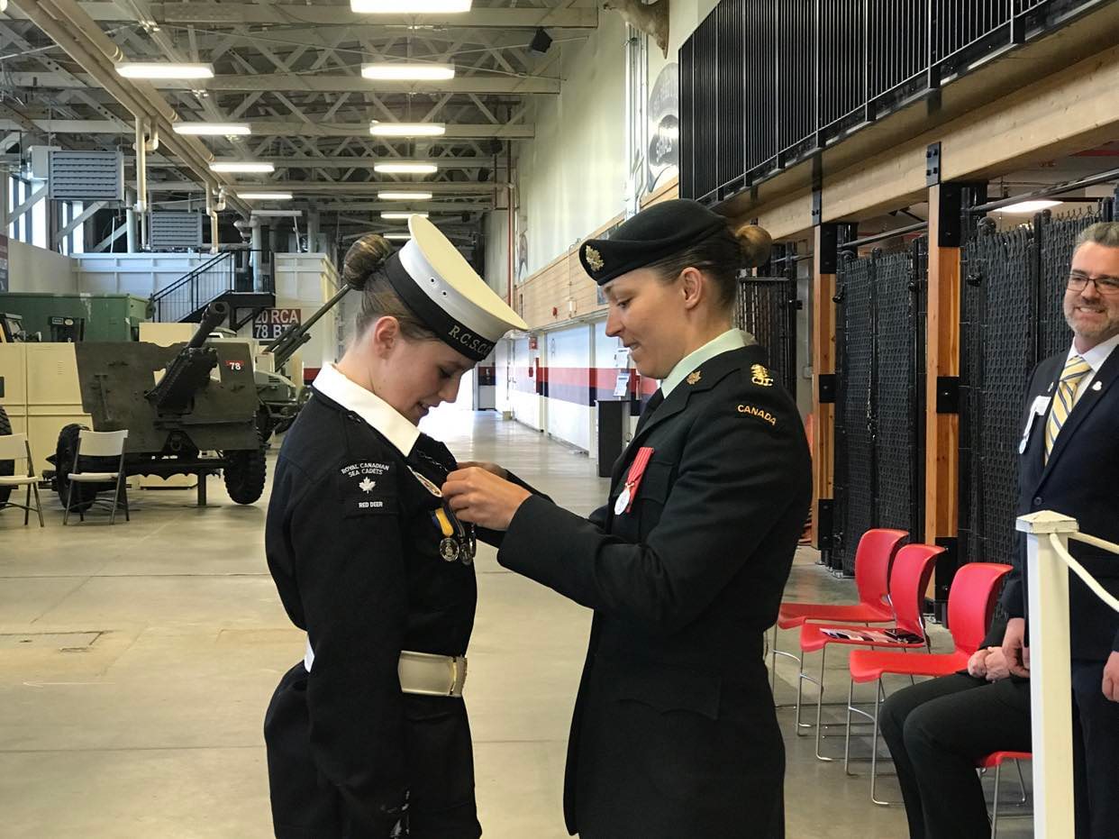 Cadet Chief Petty Officer Second Class Hannah Bennett receives her Navy League of Canada Cadet Medal of Excellence by Captain Eryn Beddoes, Commanding Officer for the Red Deer Sea Cadets. (rdnewsNOW/Alessia Proietti)