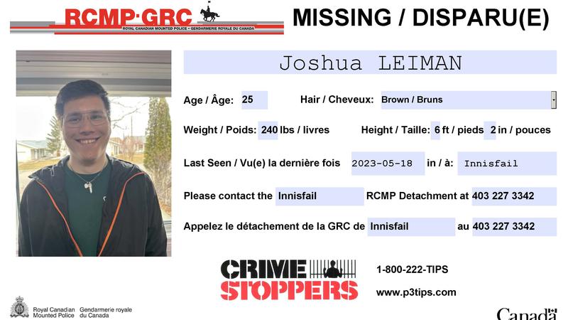 Innisfail RCMP are pleased to report that Joshua Leiman has been located safe. We would like to thank the public and media for their assistance