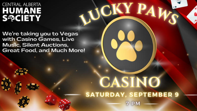 On September 9 starting at 7 p.m., the Central Alberta Humane Society (CAHS) will be hosting their first ever Lucky Paws Casino fundraiser at Westerner Park’s Harvest Centre (4847A 19 St.).