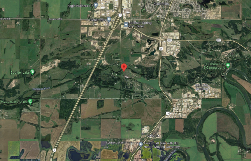 A map shows the location (52°21’24.0″N 113°49’03.3″W) of a train crossing where a Red Deer County councillor would like to see, or hear, whistle cessation. (Google Maps)
