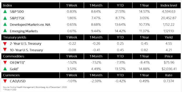 The November equity rally continued into the first day of December with most major indices extending gains and many notching new 52-week highs as the likelihood of a “soft landing” becomes more of a reality. Recent comments from U.S. Federal Reserve Chairman Jay Powell tempered expectations somewhat, but not enough to override the positive sentiment that seems to be accompanying what many believe to be the elements needed for policy makers to take their foot off the brakes. In his remarks, Powell did however push back against the burgeoning expectations of interest rate cuts ahead saying it is too soon to say whether monetary policy is “sufficiently restrictive”.