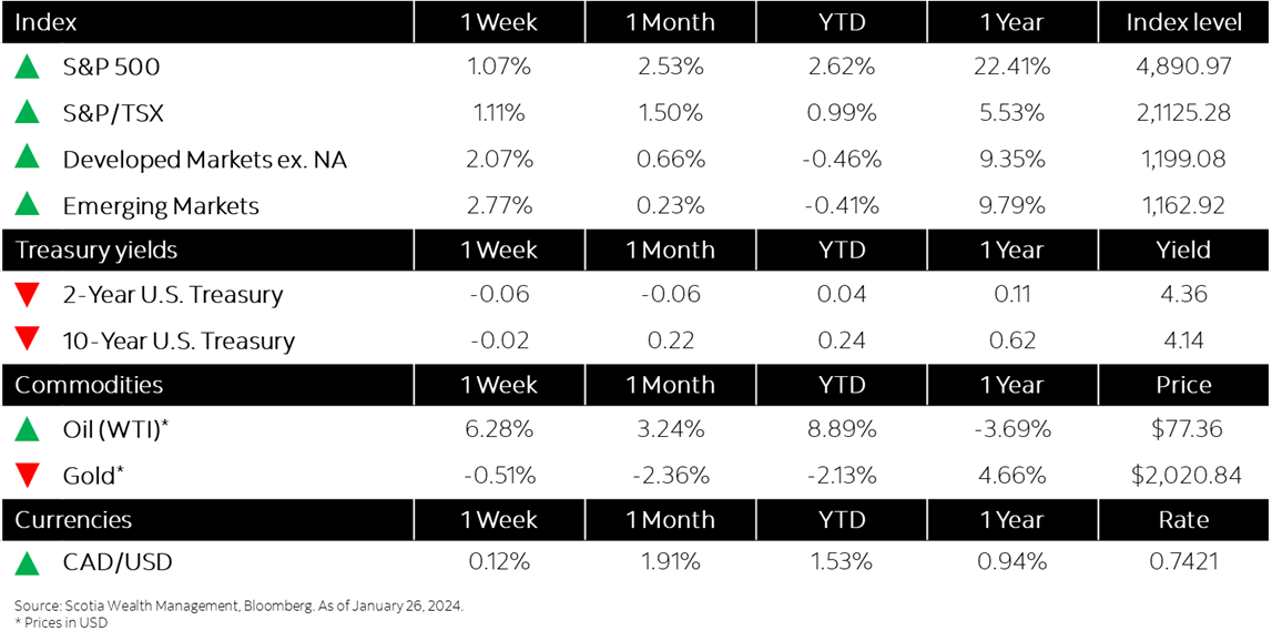 • Canadian markets rose 1.11%2 for the week with gains in technology offset by losses in utilities after a rate announcement from the Bank of Canada that left the policy rate unchanged.