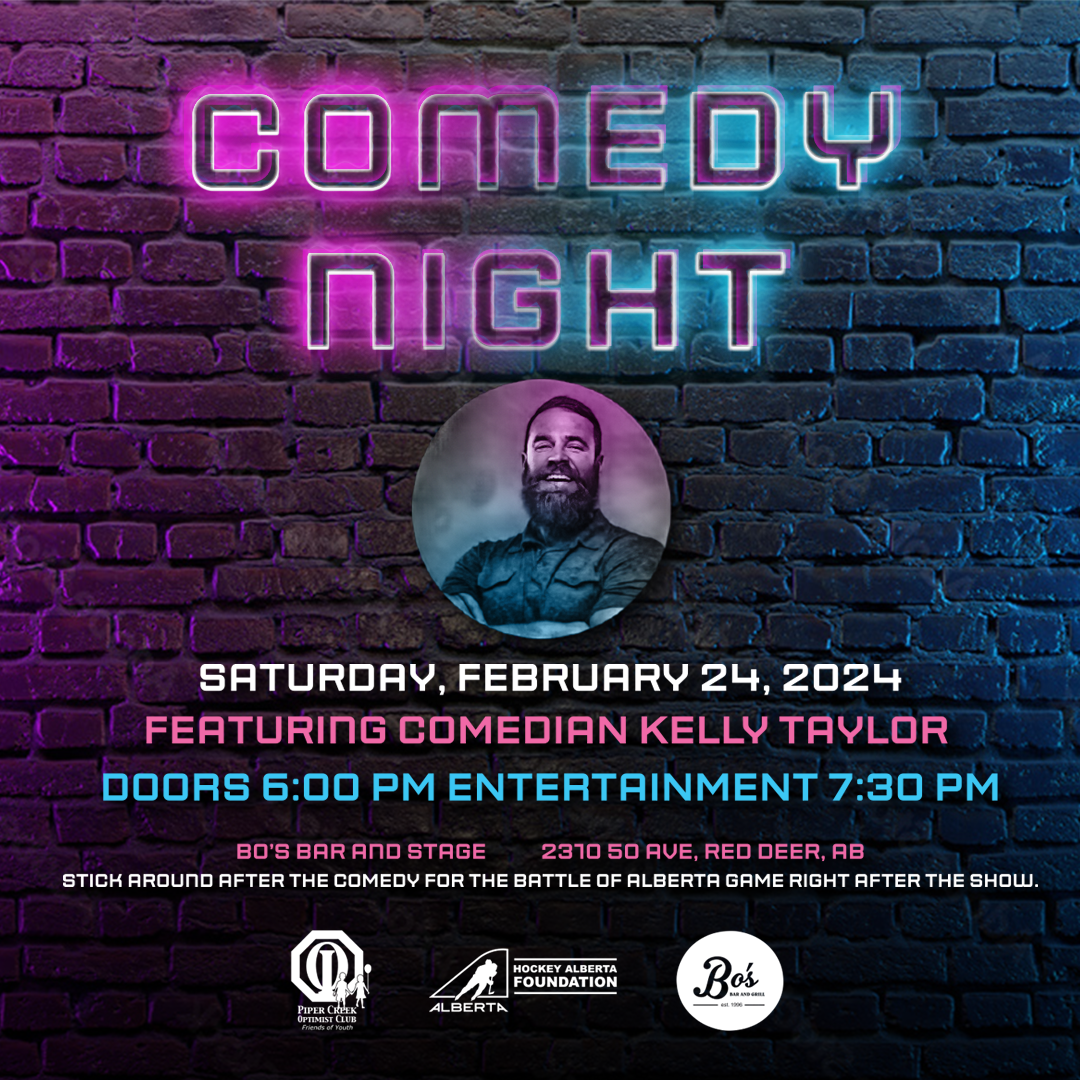On February 24, comedian Kelly Taylor will be presenting at Bo’s Bar and Stage (2310 50 Ave.), with all proceeds going to the Piper Creek Optimist Club and the Hockey Alberta Foundation.