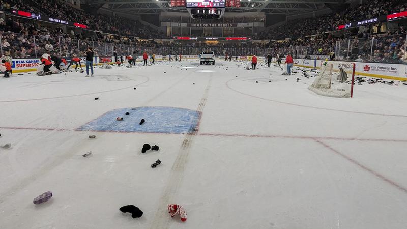 Officials say the annual event, held at the Peavey Mart Centrium, saw an incredible display of generosity from community members and dedicated partners, resulting in a record-breaking 4,813 pairs of socks being tossed onto the ice during the Family Day Rebels home game Monday afternoon.