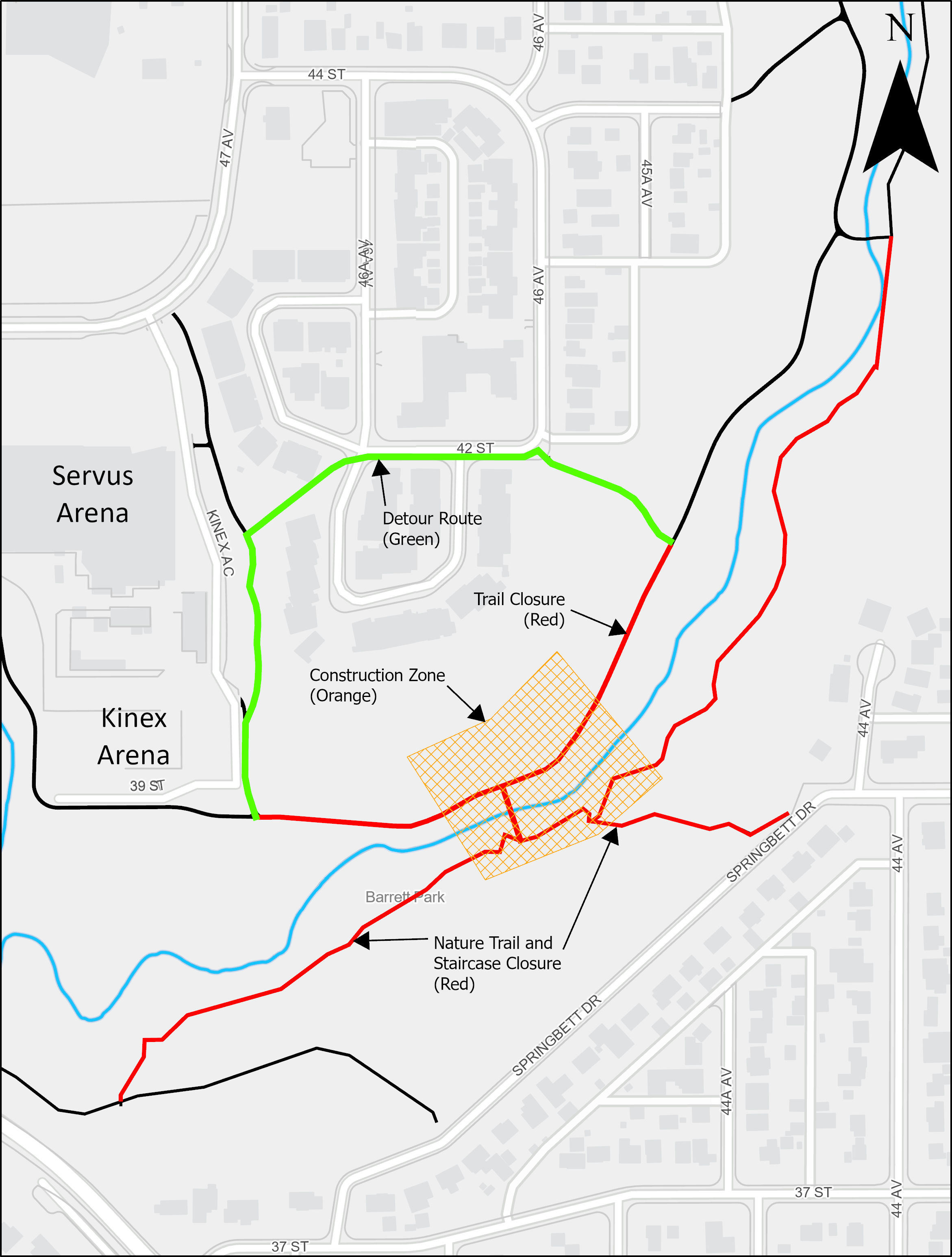 Users of the paved trail north of Waskasoo Creek will be detoured through the Parkvale neighbourhood. The nature trail and staircase south of the creek will be closed with no detour in place. These closures will be in place until approximately the end of May.