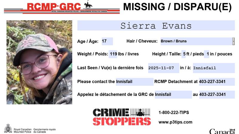 Innisfail RCMP are turning to the public for assistance in finding a missing 17-year-old girl.Sierra Evans was last seen in Innisfail early in the morning on Nov. 7 wearing a baseball cap, a black sweater, and black pants. She was also last seen driving a grey 2008 Subaru Outback with an Alberta license plate CVS 3567....
