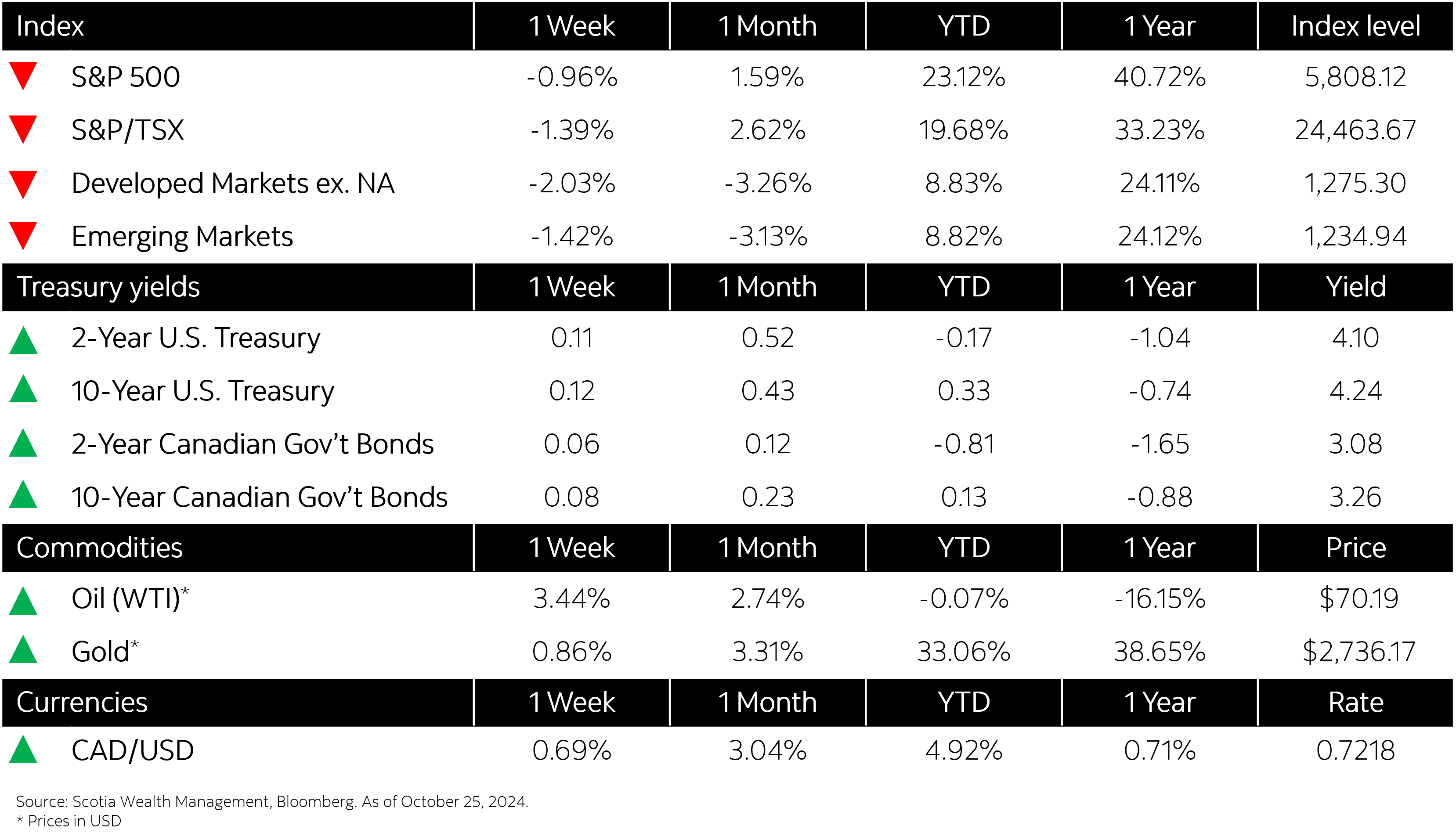 Equity markets cautiously assessed the U.S. Federal Reserve’s (Fed) next move while the earnings season is in full swing. In the U.S., it was a jam-packed week of earnings reports, more than one-third of S&P 500 companies have reported third-quarter results so far. About 75% of them have beaten profit expectations, compared with the five-year average of 77%, according to FactSet. Investors also reflected on the mixed economic data, including lower-than-expected jobless claims and a slowdown in manufacturing activity. Additionally, continued uncertainty and anticipation around the U.S. election made investors cautious, monitoring potential policy changes and their implications for sectors like technology and healthcare.
