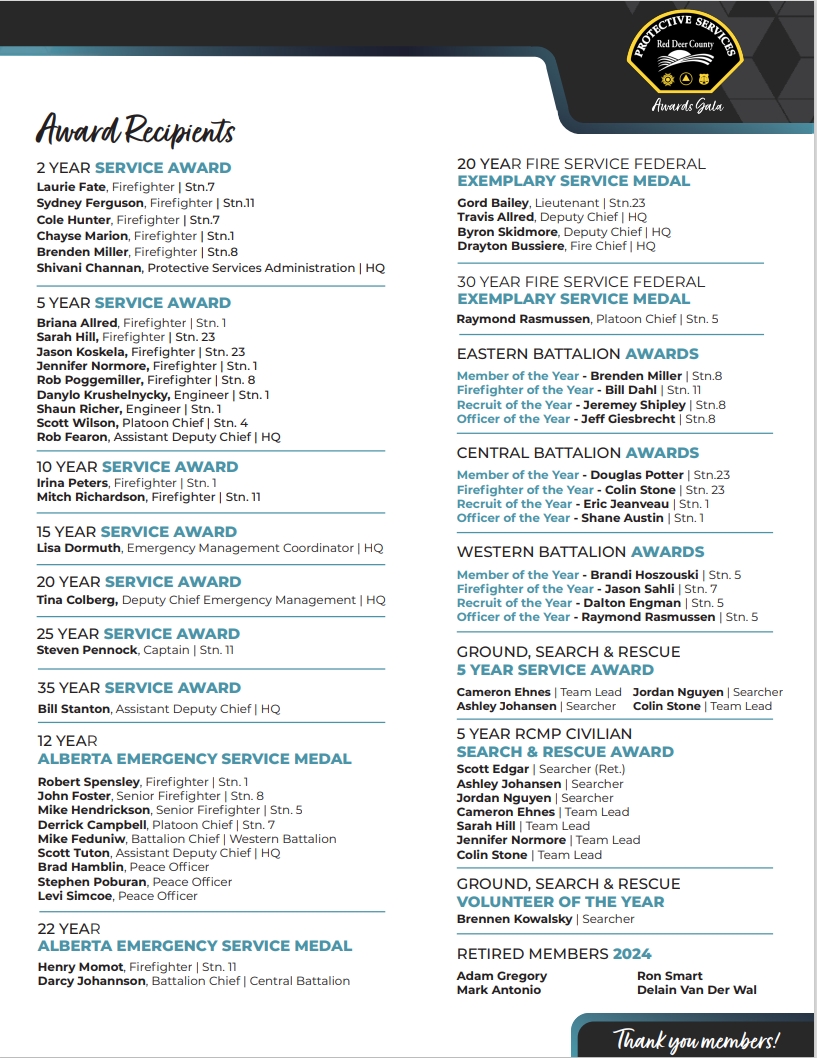 “Tonight gives us the opportunity to truly recognize these professionals and their exceptional leadership, community engagement, and teamwork across all sectors of Protective Services. Thank you to every one of our members, their families, their friends, and their employers who support them in serving Bowden, Delburne, Elnora, and The County with an unwavering commitment to making our world a better and safer place.”