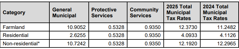 Red Deer County has approved its property tax rate bylaw for 2025, with a 1.1248 mill rate increase to farmland property, a 0.0193 mill rate decrease for residential properties and a 0.1045 decrease to non-residential properties in 2025.