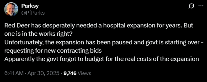 “Red Deer has desperately needed a hospital expansion for years. But one is in the works right? Unfortunately, the expansion has been paused and govt is starting over – requesting for new contracting bids Apparently the govt forgot to budget for the real costs of the expansion,” Parks, a doctor in Medicine Hat, posited.