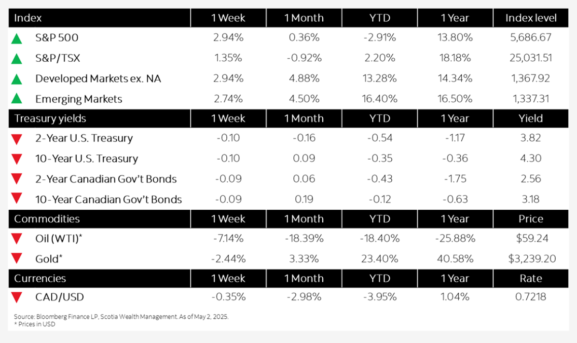 • Similar to their southern counterparts, Canadian markets returned 1.35%2 for the week with federal election results and weaker-than-expected GDP data leading to bouts of volatility as economic challenges come into the spotlight amid the U.S.’ continued tariff agenda.