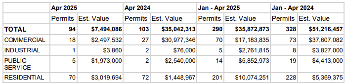 According to the city, there were 94 issued permits valued at nearly $7.5 million; that compares with 103 issued permits valued at $35 million in April 2024.