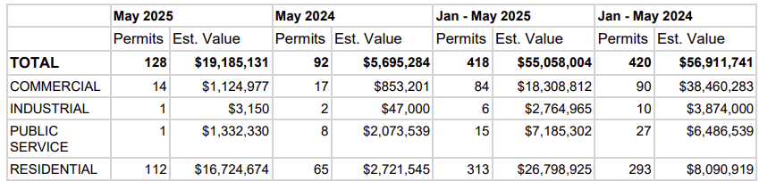There were 128 permits issued last month, worth $19 million, up from 92 issued worth $5.6 million in May 2024.