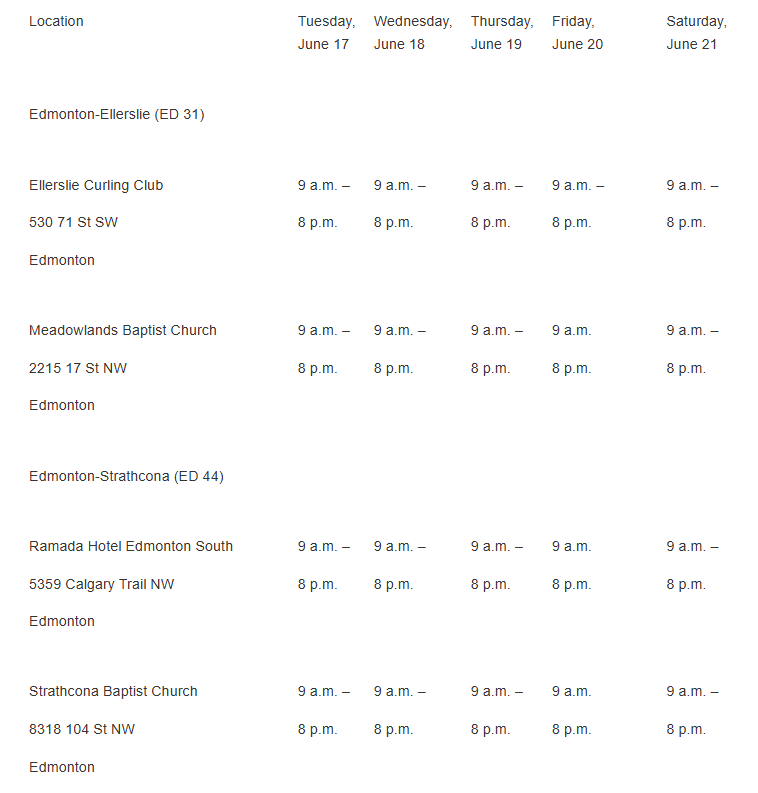 Alberta’s Chief Electoral Officer, Gordon McClure, confirms advance voting locations in Edmonton-Ellerslie, Edmonton-Strathcona, and Olds-Didsbury-Three Hills are now open.