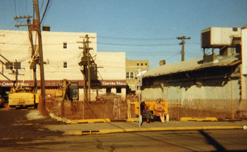 The Uptown Theatre at 4931 49 Street, amid an expansion in 1986. The lot next to the existing theatre is fenced off. Two women are sitting at the bus stop. (Red Deer Archives/P12043)