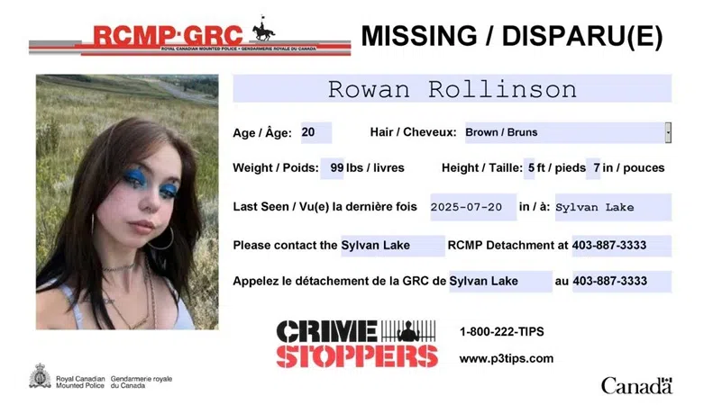 Sylvan Lake RCMP are requesting public assistance locating missing 20-year-old Rowan Rollinson.